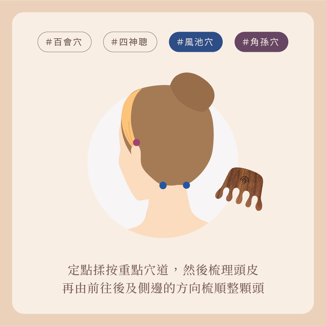 可於百會穴、四神聰、風池穴、角孫穴做定點揉按,然後梳理頭皮,由前往後及側邊的方向梳順整顆頭。