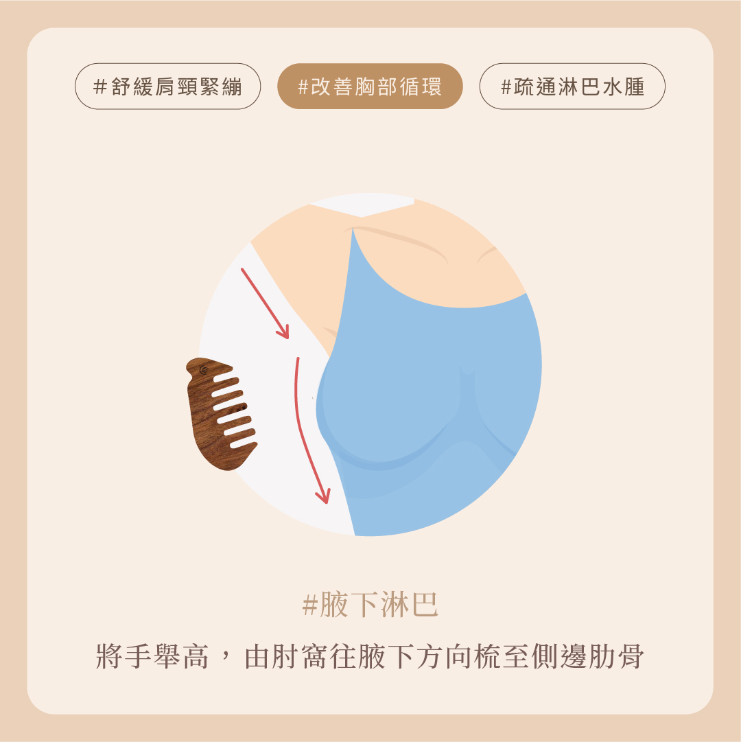 ■ 腋下部位:將手舉高,由肘窩往腋下方向梳至側邊肋骨
