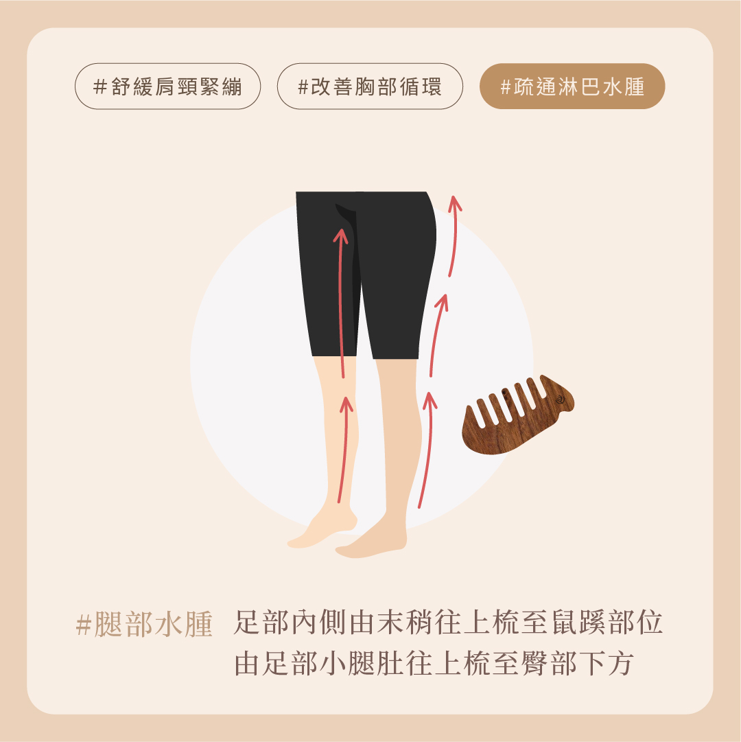 ■ 雙腿部位:足部內側由末稍往上梳至鼠蹊部位,由足部小腿肚往上梳至臀部下方