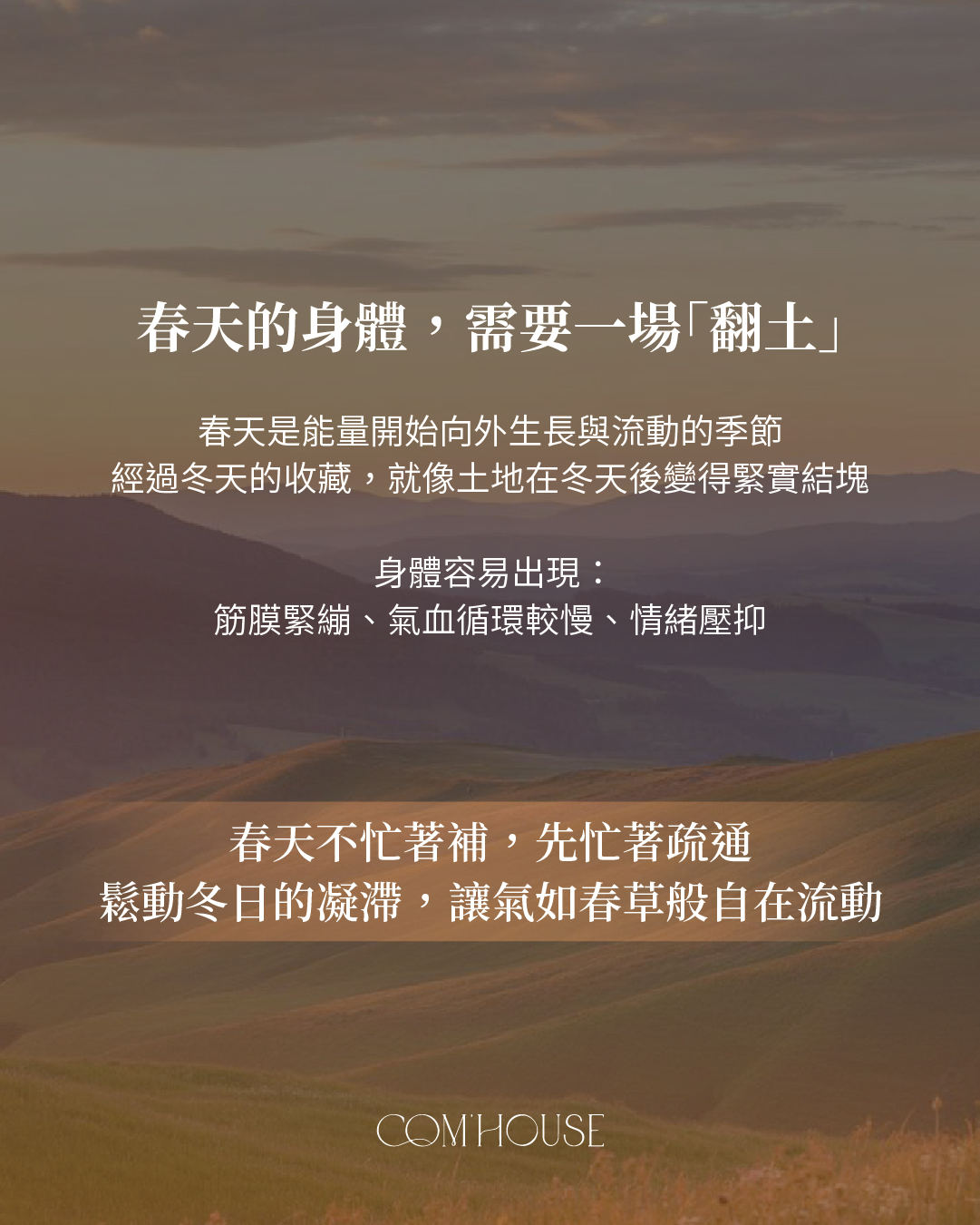 如果把身體比作土地,經過冬天的收納與休息,土質會變得比較緊實。當春天的能量想要破土而出,如果這層土(指我們的筋膜與經絡)太硬、太緊,氣就衝不出來,憋在身體裡成了「鬱」。